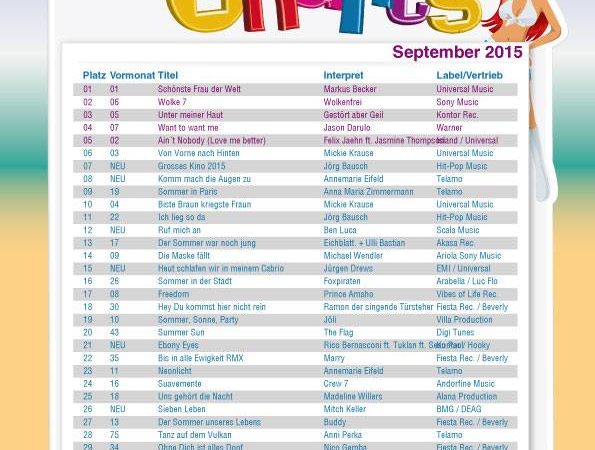 Überall werden derzeit Herbst- und Oktoberfeste gefeiert. Die Original BALLERMANN CHARTS zeigen was wirklich (!) in den Partyhochburgen von Hamburg bis München gespielt wird. "Ballermann" ist eine geschützte Marke - "Ballermann Charts" in Lizenz bei e-p-co, H.-Dieter Groß, Moers