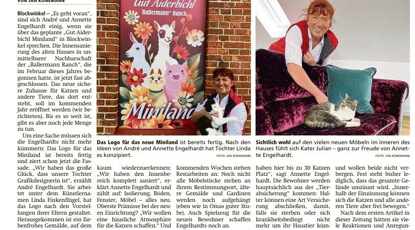 Das Gut Aiderbichl-Miniland mit "Ballermann"-Katzenvilla anliegend ein neuer Artikel über den Fortgang der Arbeiten beim neuen Gut Aiderbichl - Miniland mit der „Ballermann“-Katzenvilla, der heute im Diepholzer Kreisblatt und der Sulinger Kreiszeitung erschienen ist: https://www.kreiszeitung.de/lokales/diepholz/schwafoerden-ort59235/katzen-tiere-gut-aiderbichl-neu-zuhause-wohlfueloase-blockwinkel-tierschutz-93192936.html