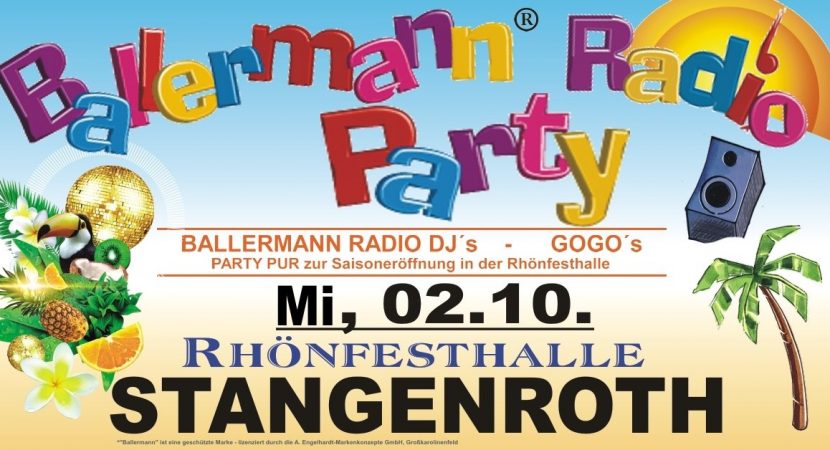 Heimspiel für BALLERMANN RADIO Saison-Opening in der Rhönfesthalle! Am Mittwoch, den 02.10.2019 steigt die Ballermann-Radio-Party zur Saisoneröffnung in der Rhönfesthalle Stangenroth. Event bei FACEBOOK: https://www.facebook.com/events/338022803438789/ ➖〰➖〰➖〰➖〰➖〰➖〰➖〰➖〰 Die Ballermann Radio DJ´s werden die Rhönfesthalle an diesem Abend mit Ihrem Musikmix zum überkochen…